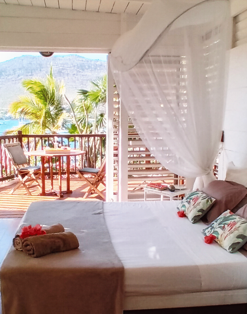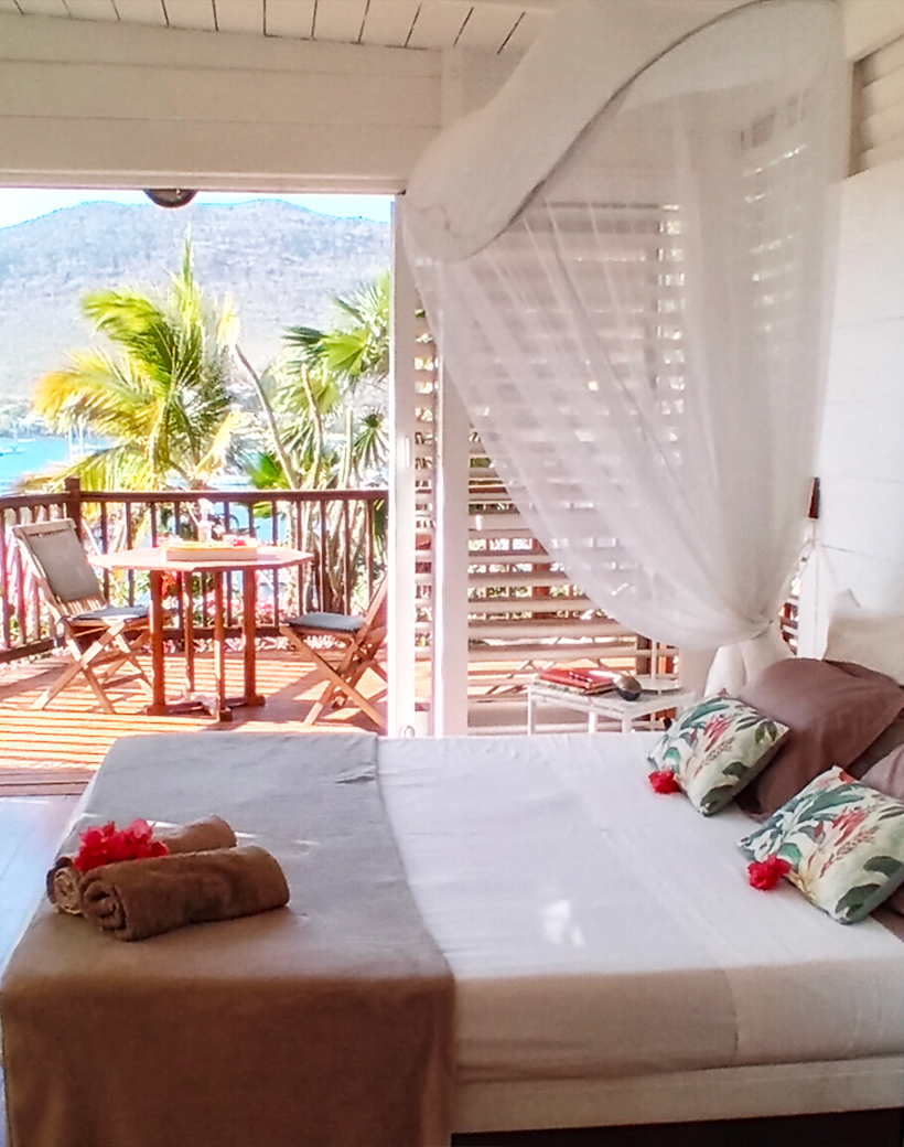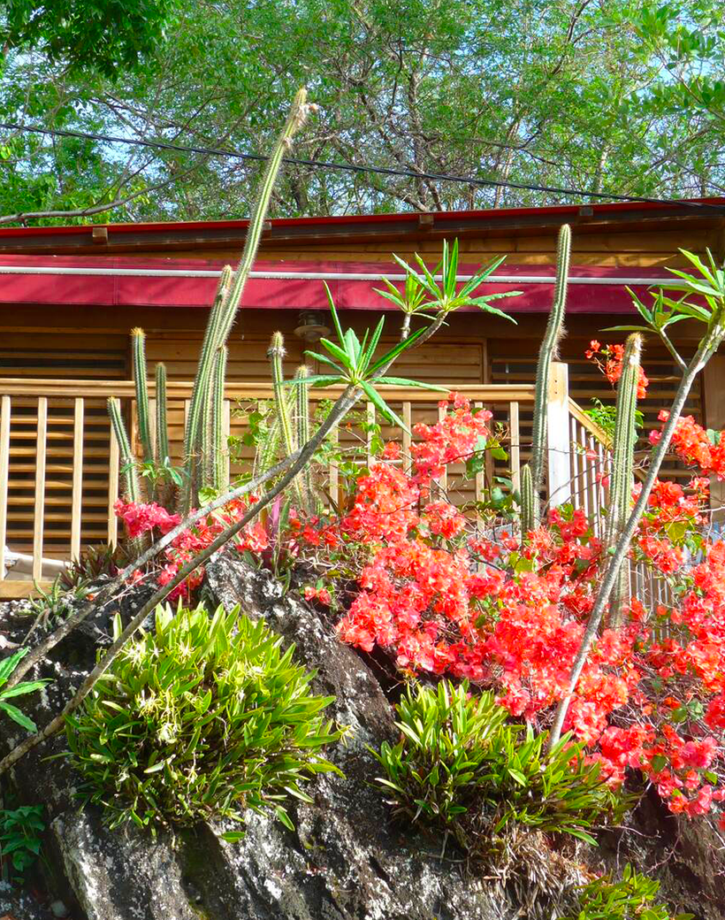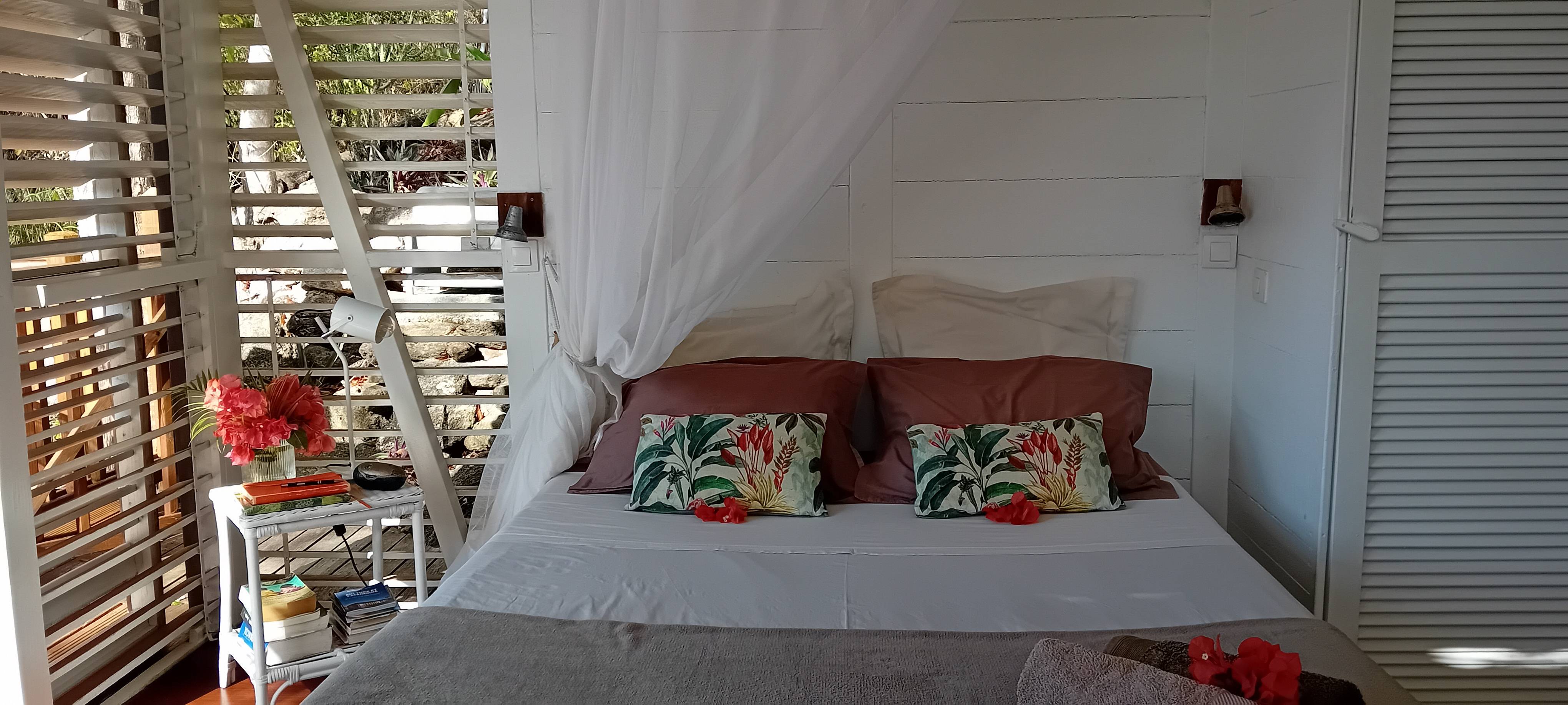 Les persiennes en bois du sol au plafond, la terrasse dominant le jardin tropical et la baie, le chant des oiseaux et des grenouilles nocturnes concourent à faire du Bungalow Borakaye le lieu idéal pour découvrir notre île et goûter à son art de vivre.
