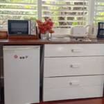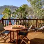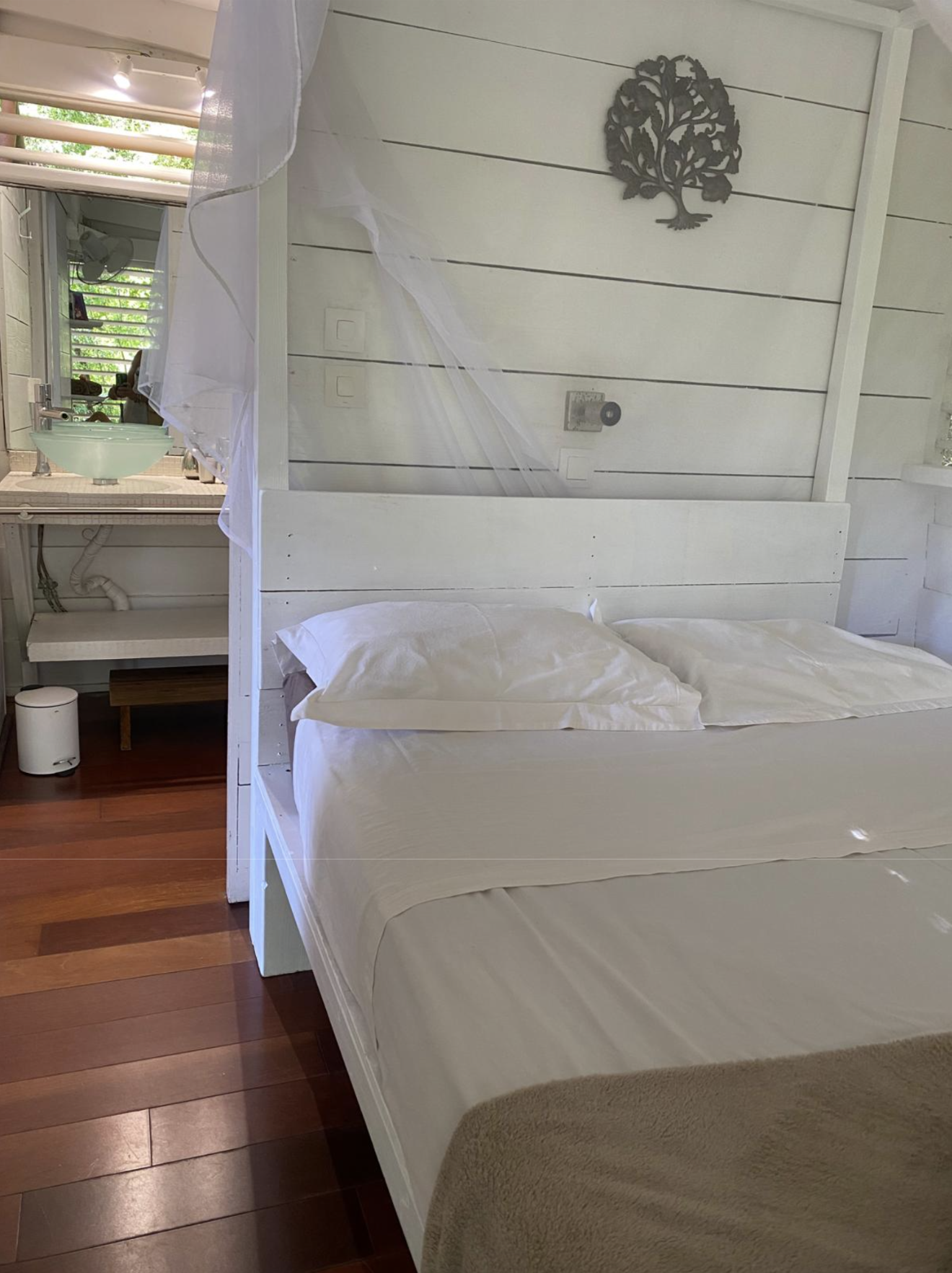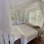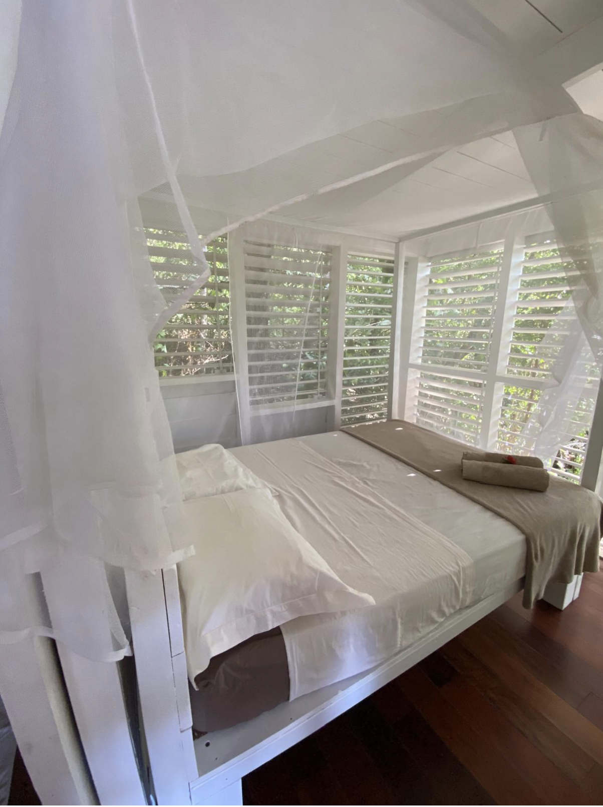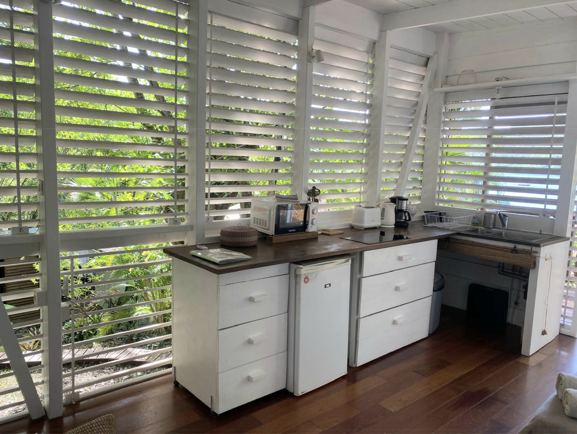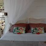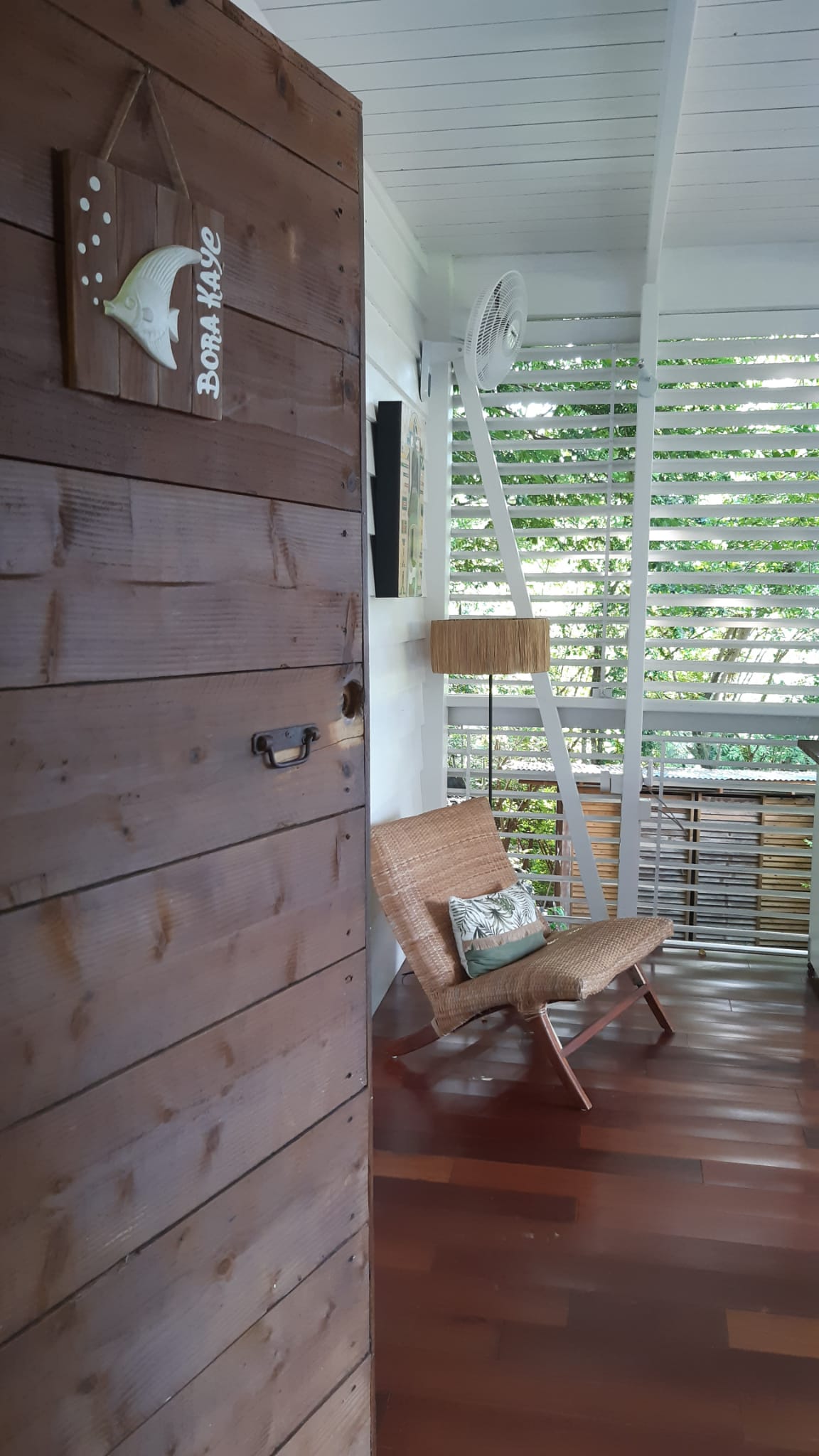 Les persiennes en bois du sol au plafond, la terrasse dominant le jardin tropical et la baie, le chant des oiseaux et des grenouilles nocturnes concourent à faire du Bungalow Borakaye le lieu idéal pour découvrir notre île et goûter à son art de vivre.